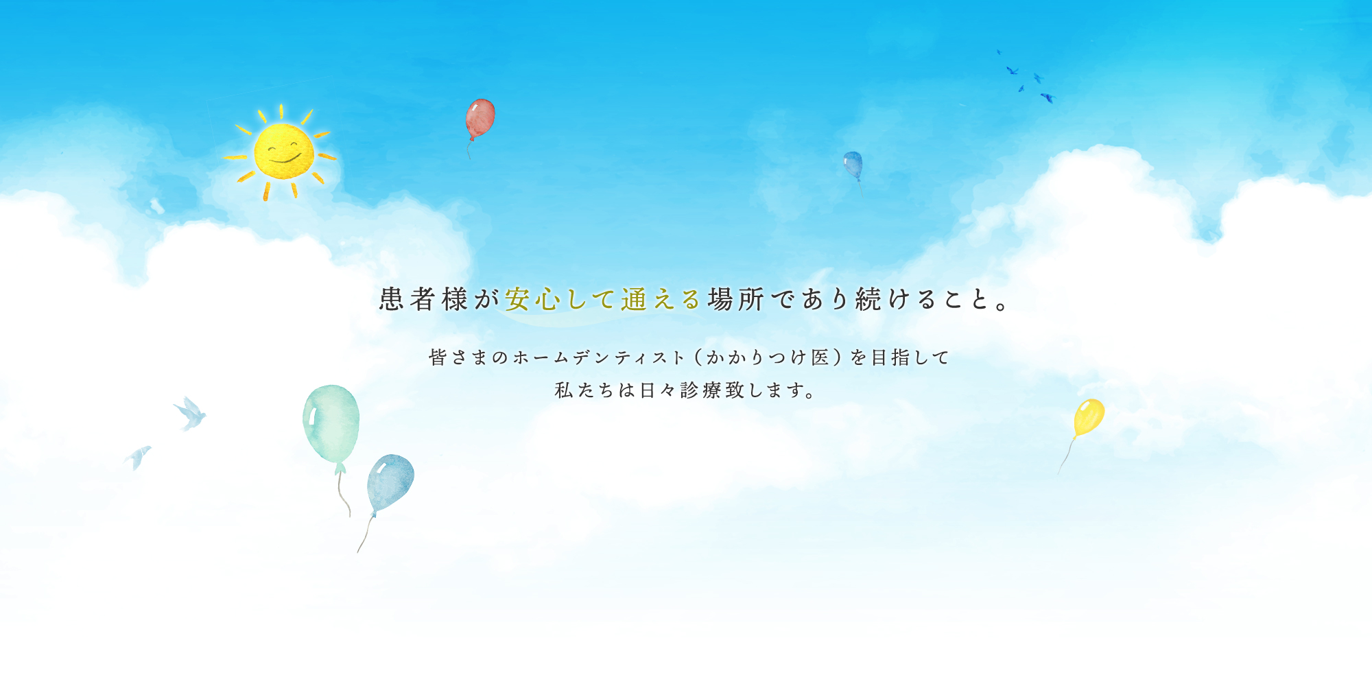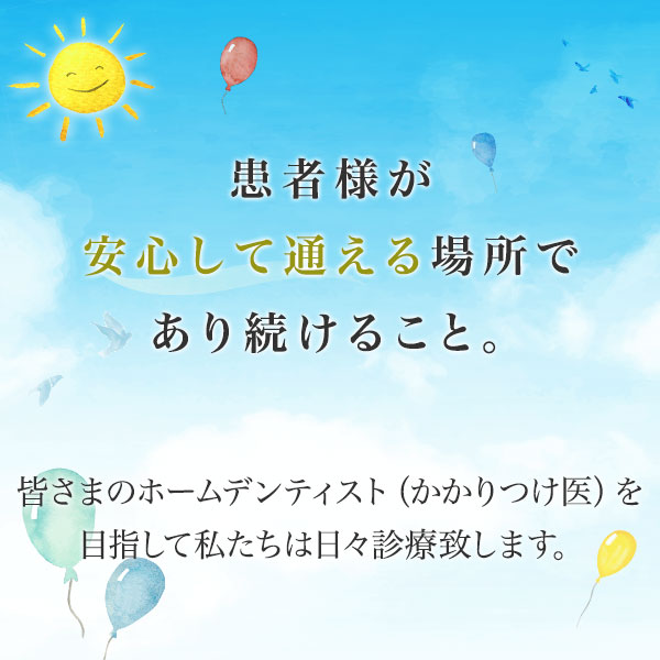 当院では小さいお子様からご高齢の方までご家族全員のお口のケアをできる、いわゆるホームデンティストを目指しております。